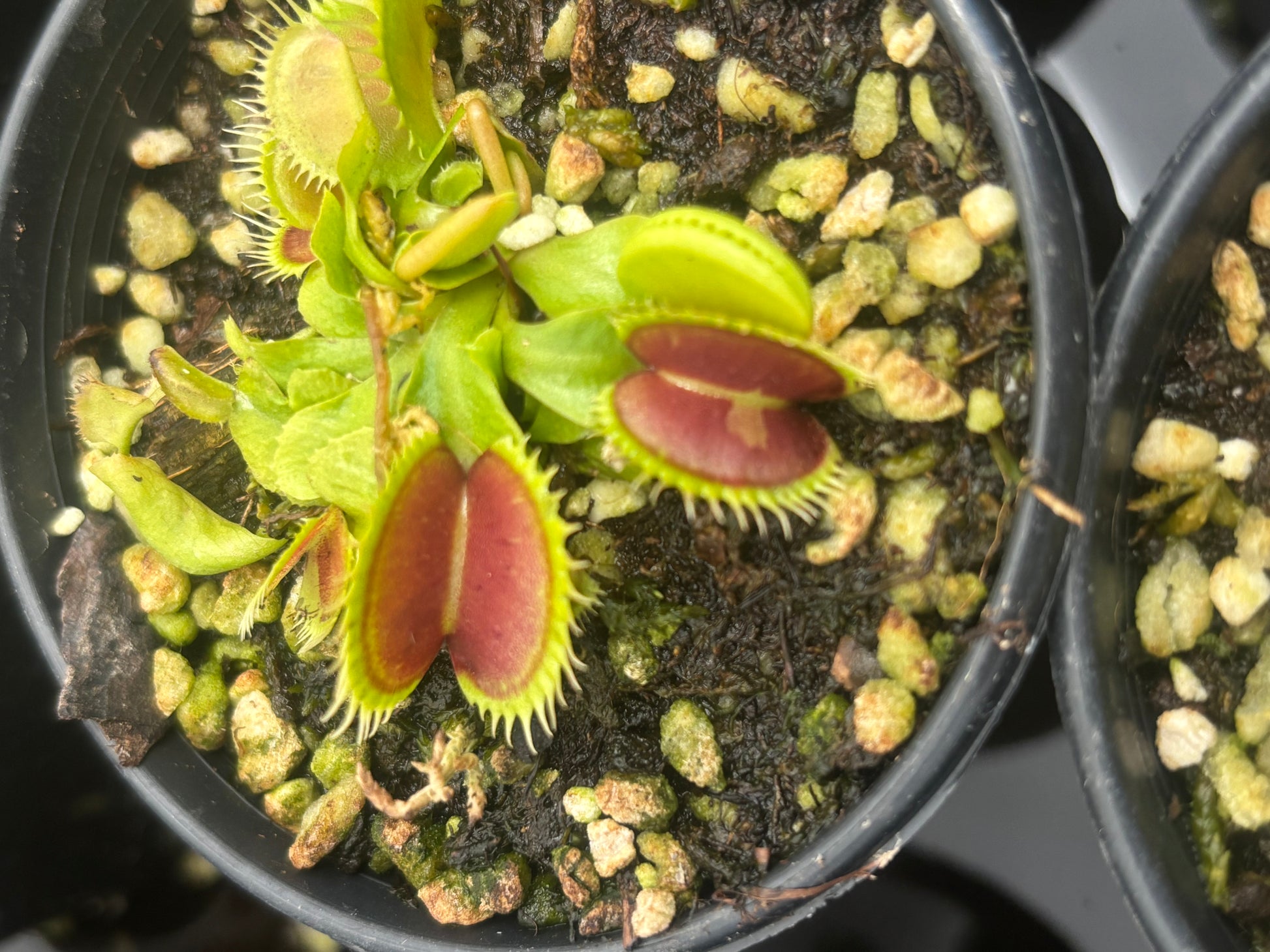 Dionaea muscipula “Double Face” is an upright Venus flytrap resulting from the crossbreeding of ‘DCXL’ x “UP GIANT”. Its teeth are slightly short, sharp, and robust. What sets this clone apart are the distinctive bleached spots on some leaves, making it a must-have for all growers!