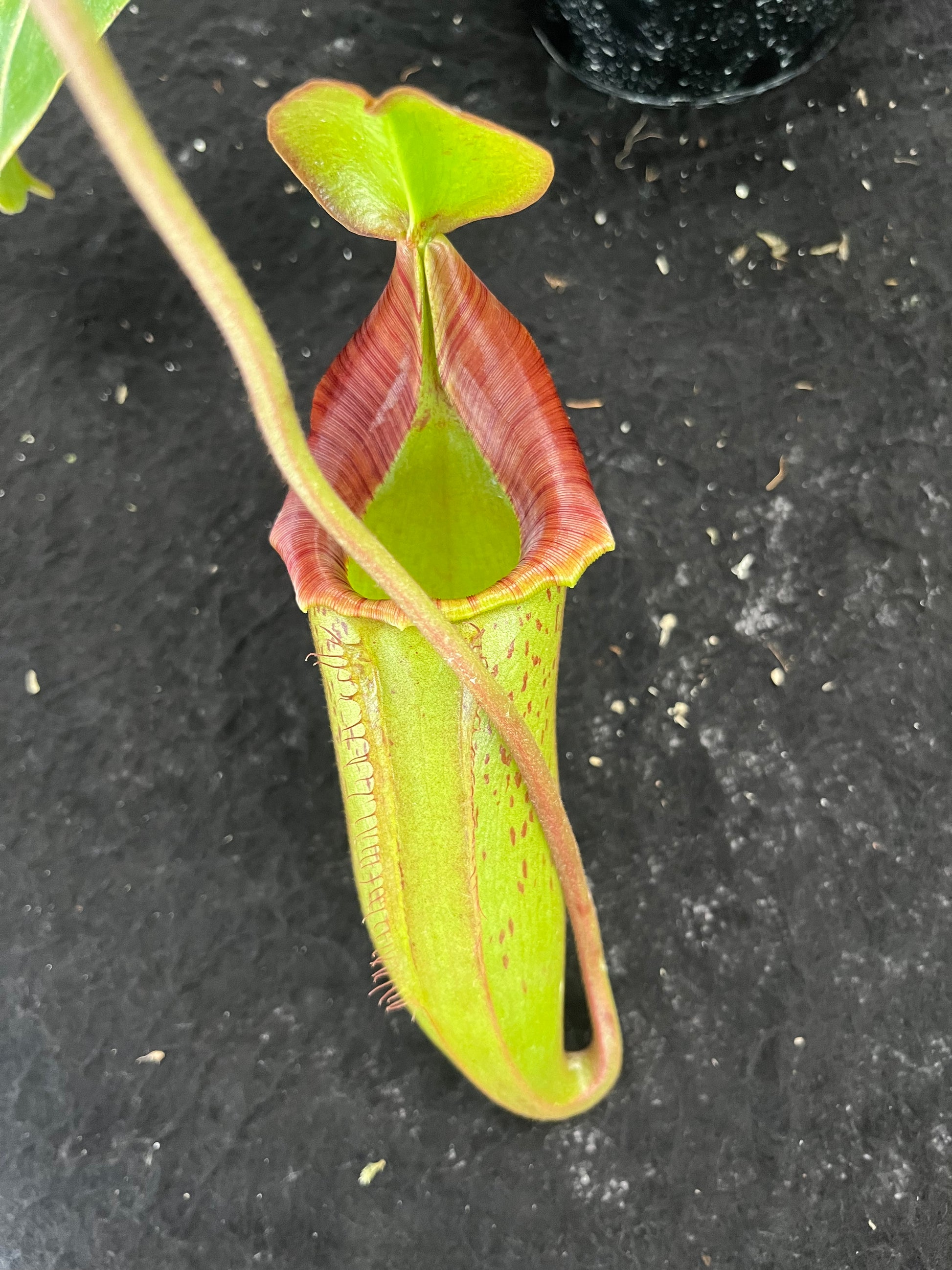 This spectacular complex hybrid produces large pitchers with beautifully coloured and triped peristomes.