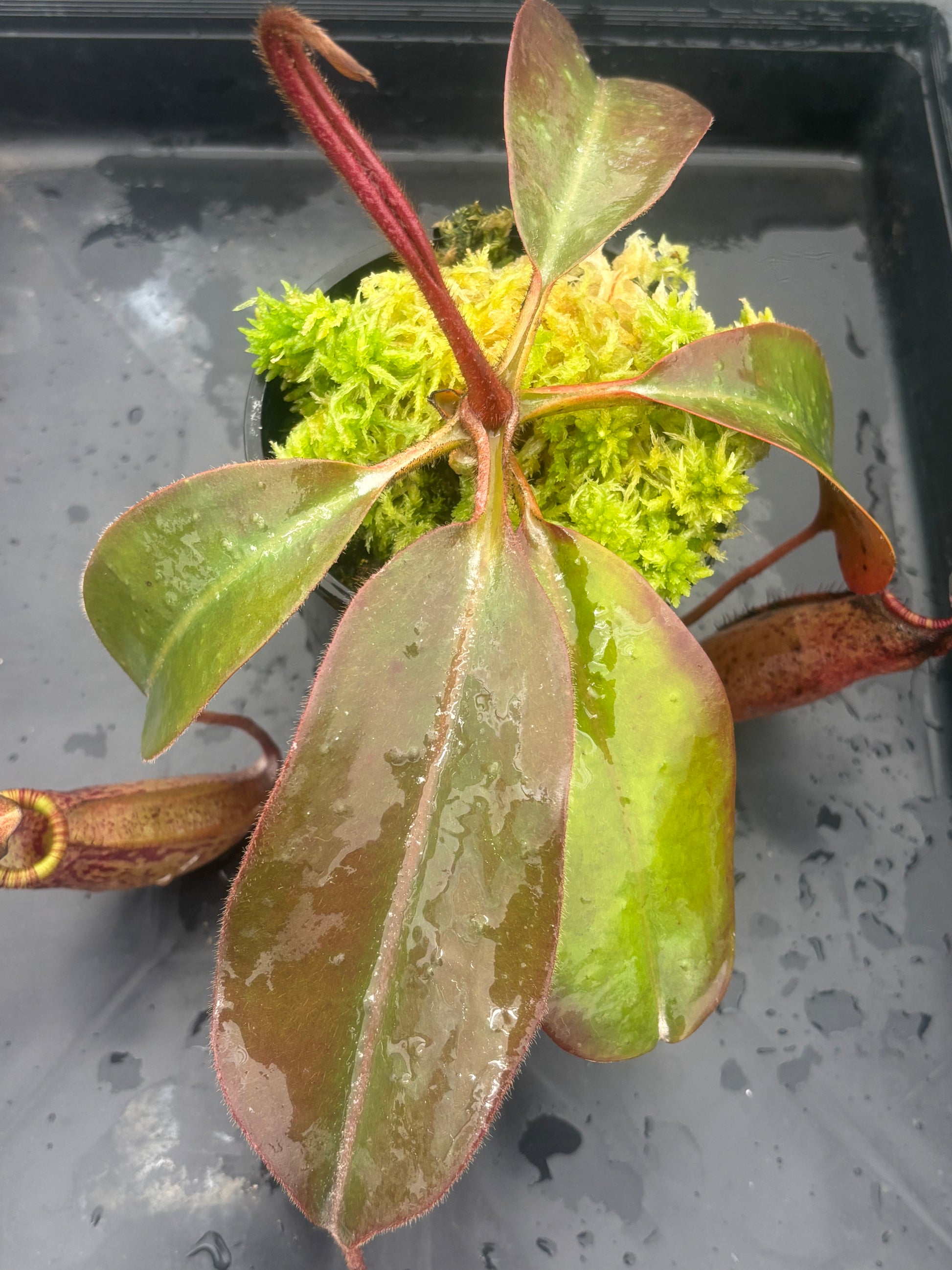 Nepenthes peltata x (veitchii x lowii) BE-4516. This is a very new hybrid by Borneo Exotics. This cross has the parentage from 3 very spectacular and unique species. So far there are only juvenile plants available, however, it is already showing spectacular stripes and stunning coloration.