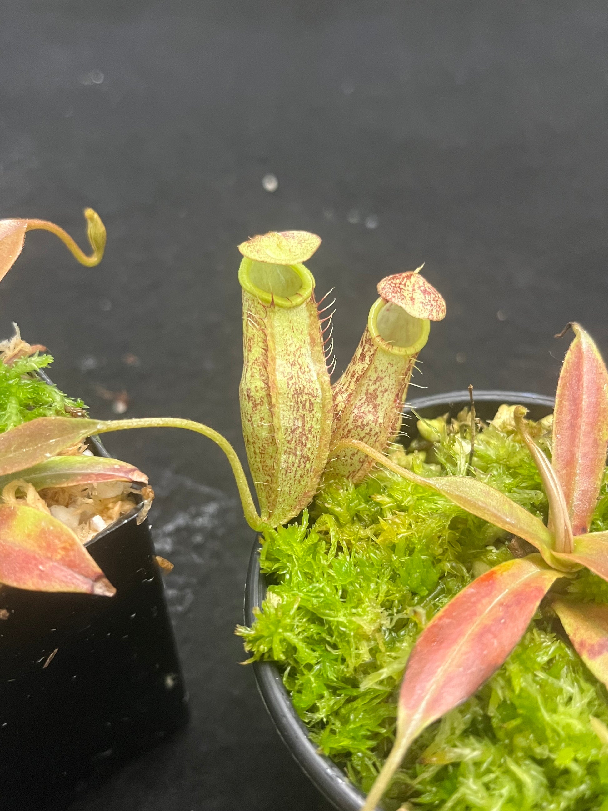 Nepenthes spectabilis x mira BE-3181 is a stunning hybrid with bright yellow pitcher colour and dark stripes and speckles, which create a wasp alike appearance.